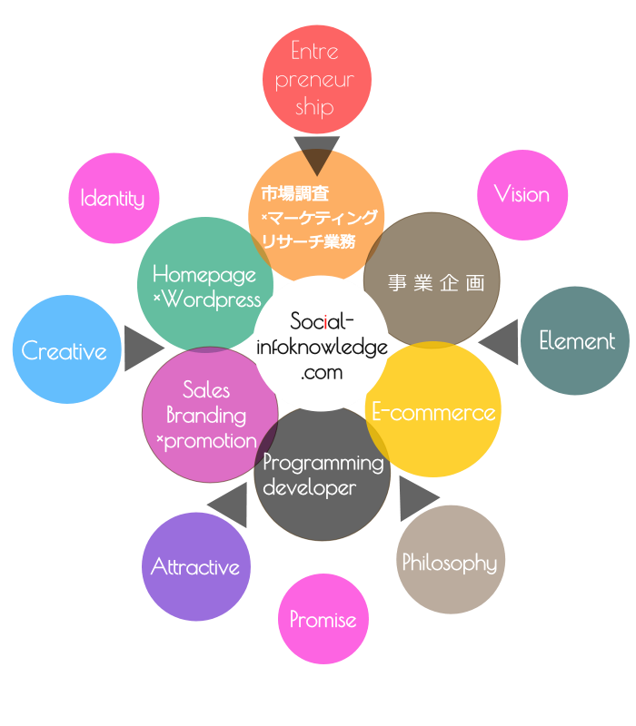 経験・知識・ノウハウを活かしたビジネスプランを構築し、特化したビジネス戦略の構築ソーシャル基盤に情報・ビジネスノウハウリソースを活用して戦略とビジネス手法を慎重に選択をしていきながら新たなビジネスに挑むことがソーシャル・インフォナレッジの名前の由来です。